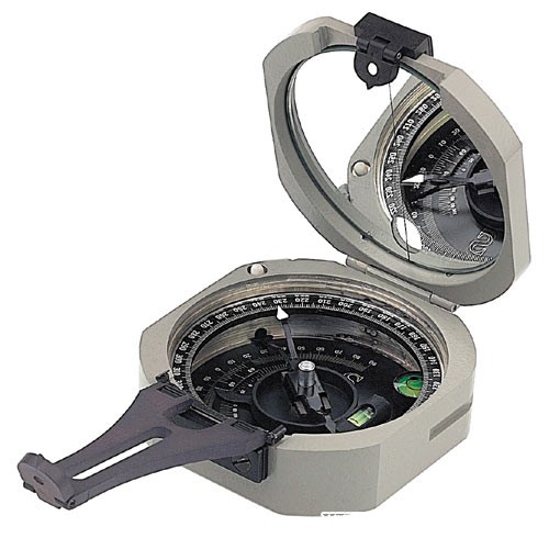 Brunton 5006 GEO Pocket Transit dengan mekanisme penguncian jarum Adjustable, inklinometer Engsel, dua panjang tingkat Bubbles, Single NdFeB magnet and Sapphire jewel bearing.